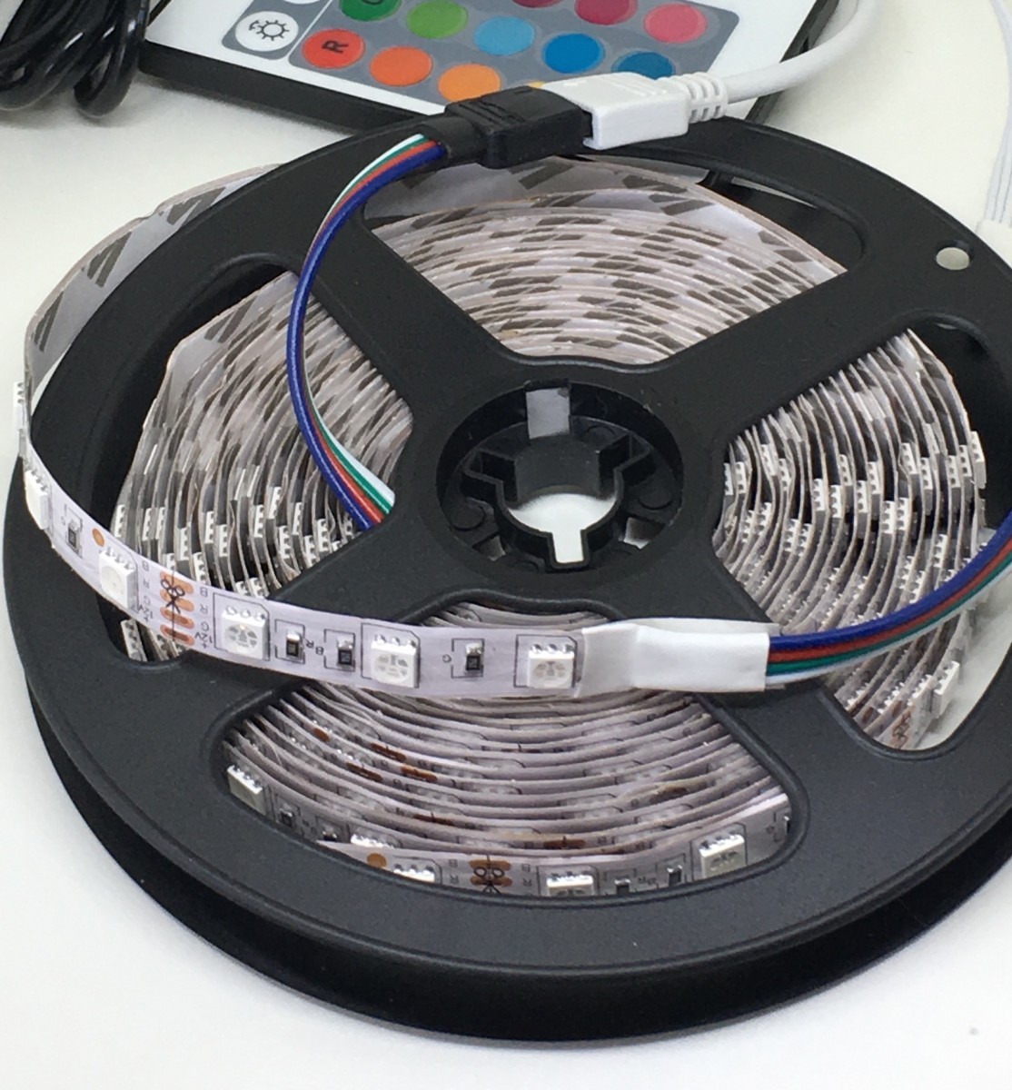 端にコネクタがついている場合もありますが,通常はリード線をハンダづけするか,テープライト用コネクタを使用する必要がありますので,ご注意ください.