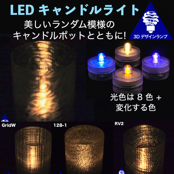 螺旋 3D 印刷はガラスや従来のプラスティックではできない細密な模様がつけられるので,きらめく光をだすのです.なお,これらのキャンドルキャップはランダムさがあるといってもデザインは固定されていて,おなじ番号・記号がついたものを複数個買うとほとんどおなじものになります.これらの模様は 20 波程度の波のくみあわせでできます.