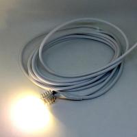 スマホの充電などに使用するための白色のケーブルですが,Micro USB コネクタをきりおとすなどして,他の目的に使用することができます.ケーブルは通常どおり 4 本の電線をふくんでいますが,赤・黒の 2 本だけ使用すれば USB 電源 (5 V) をとることができます.細い電線を使用していますが,ながさ 1 m なので 5 W 以下の消費電力なら問題ないでしょう.3 番めの写真は 3 m のケーブル (他製品) の使用例です.