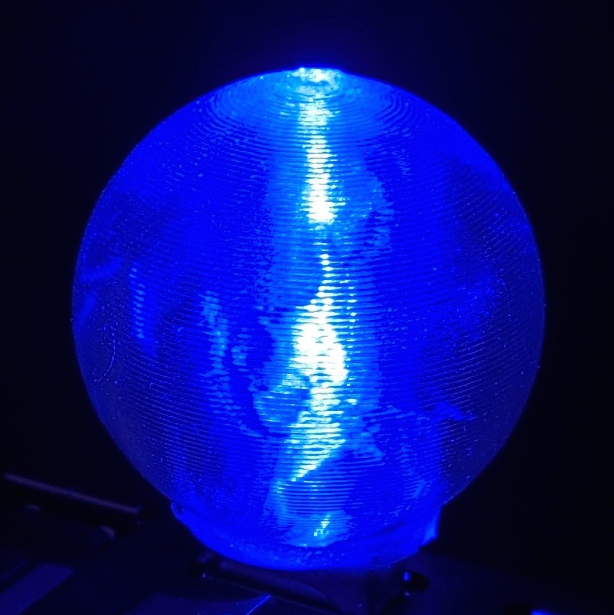 USB ポートにさしこんでつかう,ちいさなライトです.1 個の青色 LED の光を 3D 印刷したクリアな中空で直径 2.8 cm の地球儀がひろげます.パソコンのそばを照らしたり,電源アダプタとくみあわせてフットライトなどとしてつかえます.(ただし,薄型 PC の USB ポートにつなぐとテーブルにぶつかる可能性があります.)