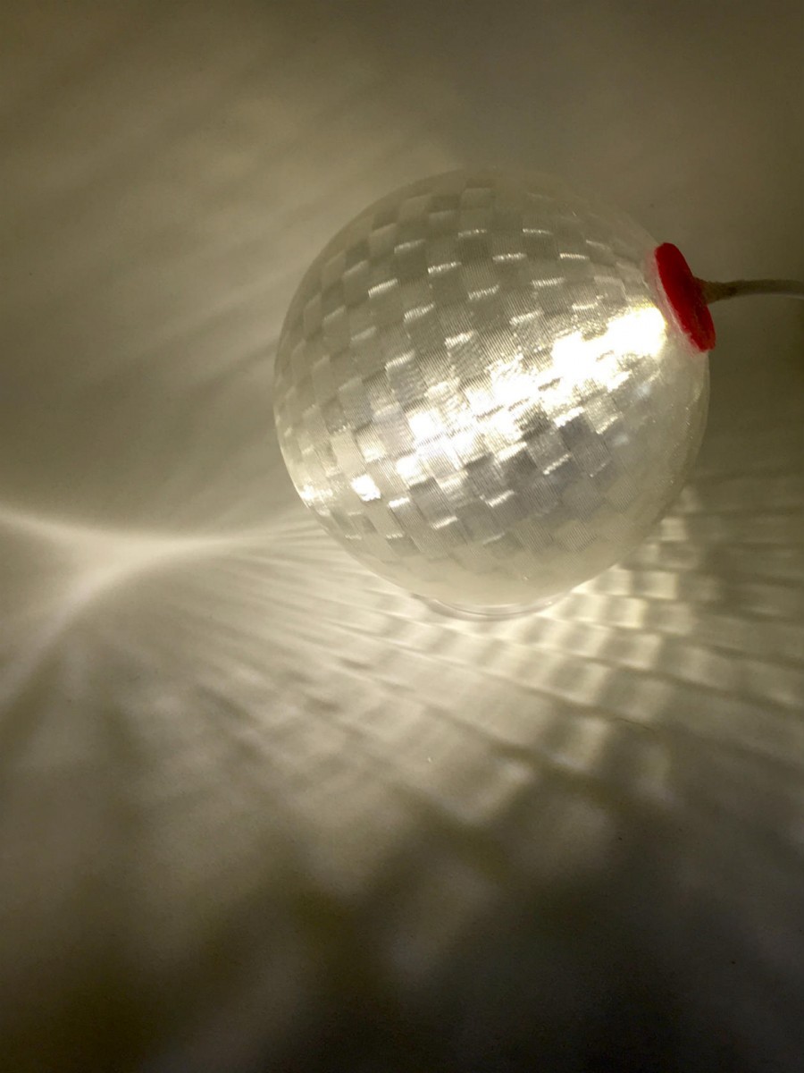 シェードは PLA というプラスティックをつかった 3D 印刷で 1 回らせん状にまきつけてつくっています.通常の 3D 印刷とはちがう新開発技術 (特許出願中) です.同様の方法でつくっている地球儀の印刷のようすを YouTube でみることができます.