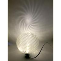 LED を透明でとても軽くて美しく輝くシェード (セード) でつつみました.付属の足 (輪) にのせてスタンドにすると,さまざまな角度で照明できます.テーブルランプやフロアランプとしてつかうとテーブルや床・壁などに美しい陰をおとしますが,角度をかえると陰がさまざまに変化します.