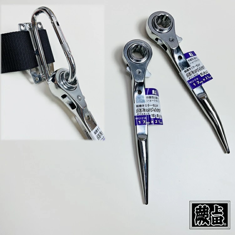 【ダブルカット仕様】蕨上田 特注 ラチェット 総磨きラチェットレンチ 17mm×21mm ダブルカット カラビナ掛け可 短直/短曲 ミラー仕上げ