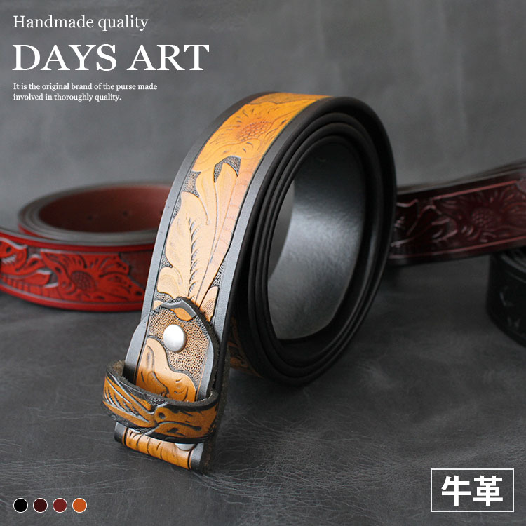顔料仕上げの牛革を使用して製作したレザーベルトです。全体に美しいフラワーカービングが施されています。ネジ式でバックルが留められるようになっているのでお好みのバックルを付けて使用することができます。※ピン型バックルを取り付ける場合は縦型の穴空けが必要です。