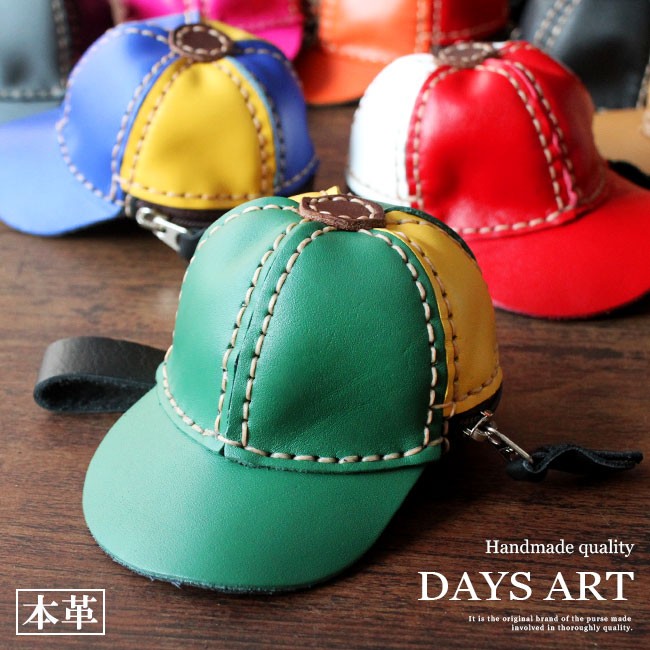 本革で製作したキャップモチーフのコインケースです。ツバの曲線までリアルに表現されており、カラフルなツートンカラーでかわいいデザインになっています。ワックスコード手縫いで仕上げたハンドメイド製となっており、ストラップ付きで持ち運びに便利です。草野球や少年野球をやられてる方へのプレゼントにもおすすめです。