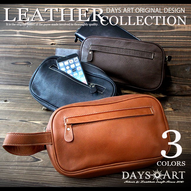 | キメが細かくとても柔らかくて肌触りのいい上質のカーフスキン(子牛の革)を使用し、革職人がハンドメイドで製作しています。財布やスマホなど小物を収納するのに丁度いいサイズでビジネスでもプライベートでも使えるシンプルなデザインになっています。外部と内部のファスナーポケットは小分けに便利で、収納物を傷つけないよう裏地は不織布になっています。持ち手が付いているので持ち運びもしやすく、普段使いにおすすめなメンズバッグです。 |