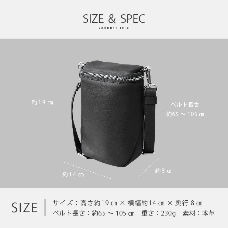 縦約19cm 横約14cm 厚み約8cm ベルト長さ約65〜105cm 重さ約230グラム