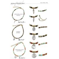 色鮮やかな天然石に真鍮製の黄金色のパーツが落ち着いた独特の雰囲気を醸し出します。トップはフェザー、マリア、コインと3タイプから選べ、留め具はアジャスタータイプになっていますので、着け易さはもちろん、サイズもお好みで調整することができます。