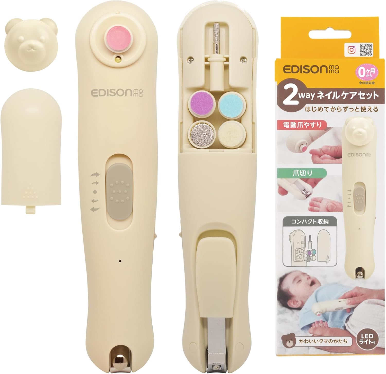 電動爪やすりと爪切りの2wayで0歳〜大人まで長く使えます。