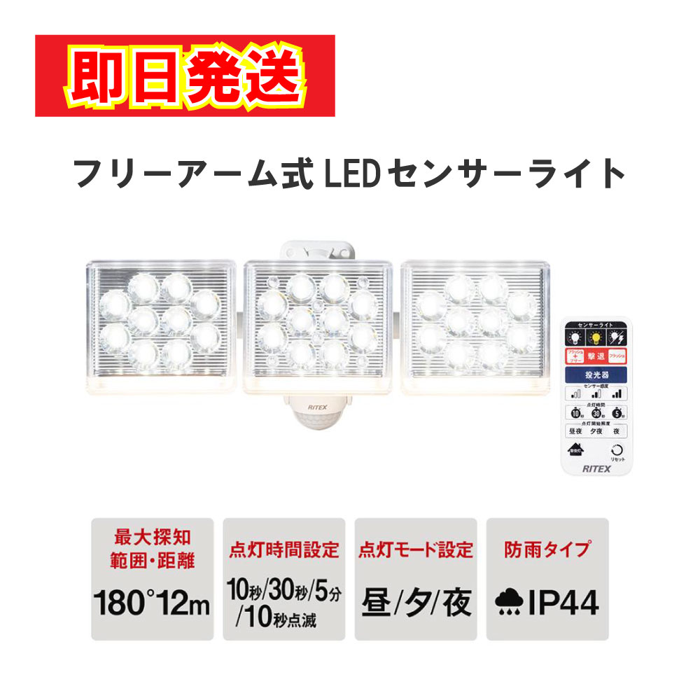 あすつく 最短 翌日配達 ムサシ 12W×3灯 フリーアーム式 LEDセンサーライト リモコン付 LED-AC3045 ライト 防犯対策 家 玄関 庭 倉庫 車庫