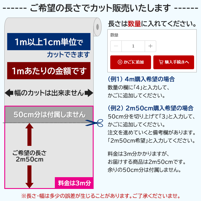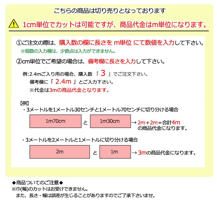センチ単位でのカットも可能ですが、商品代金はメートル単位で計算致します。
