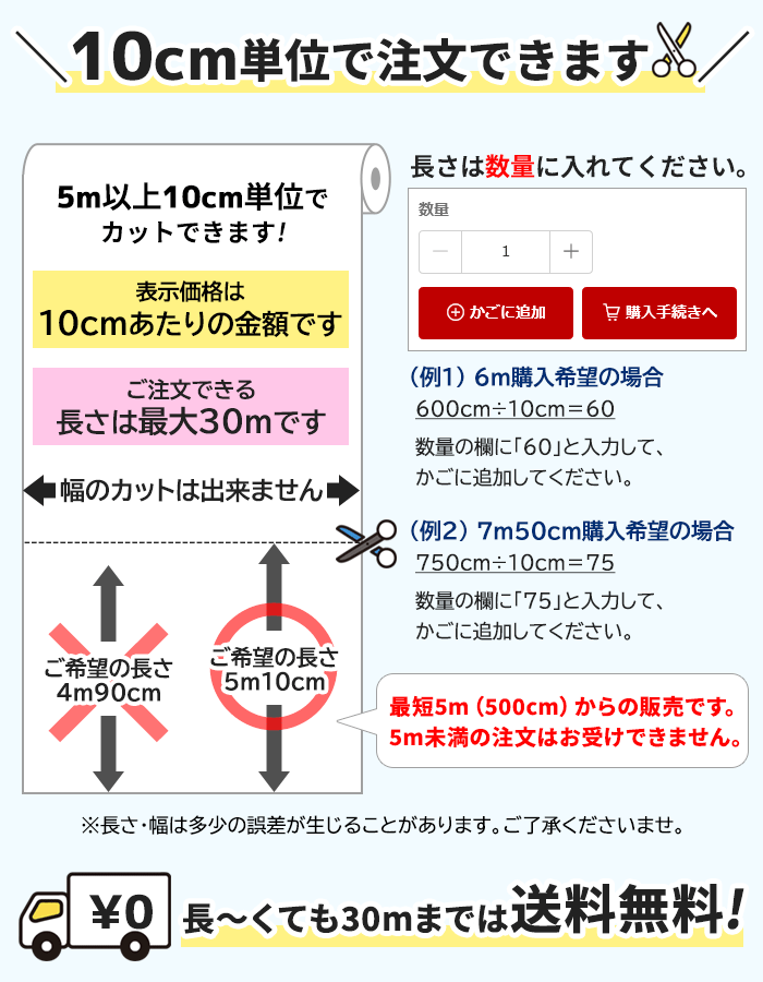 (例:5m50cm欲しい場合は、個数の欄に「55」と入力してください。)