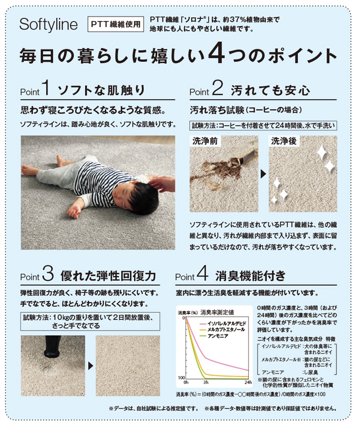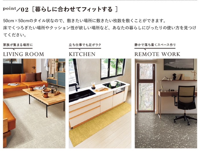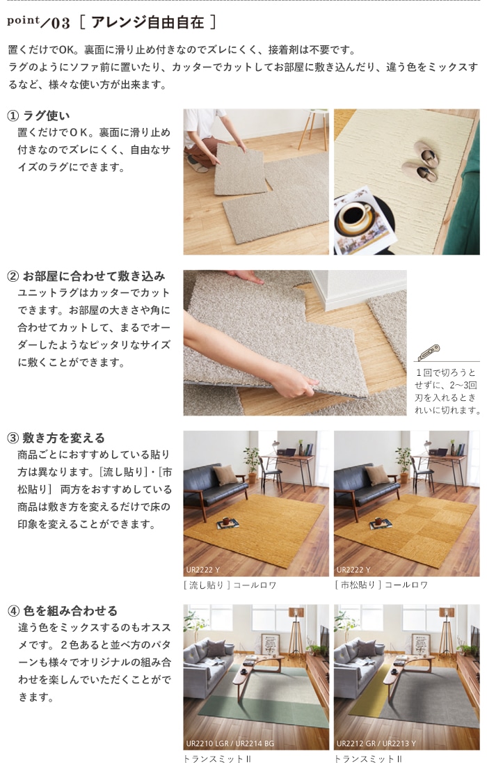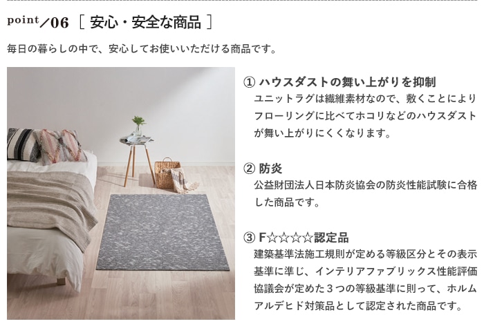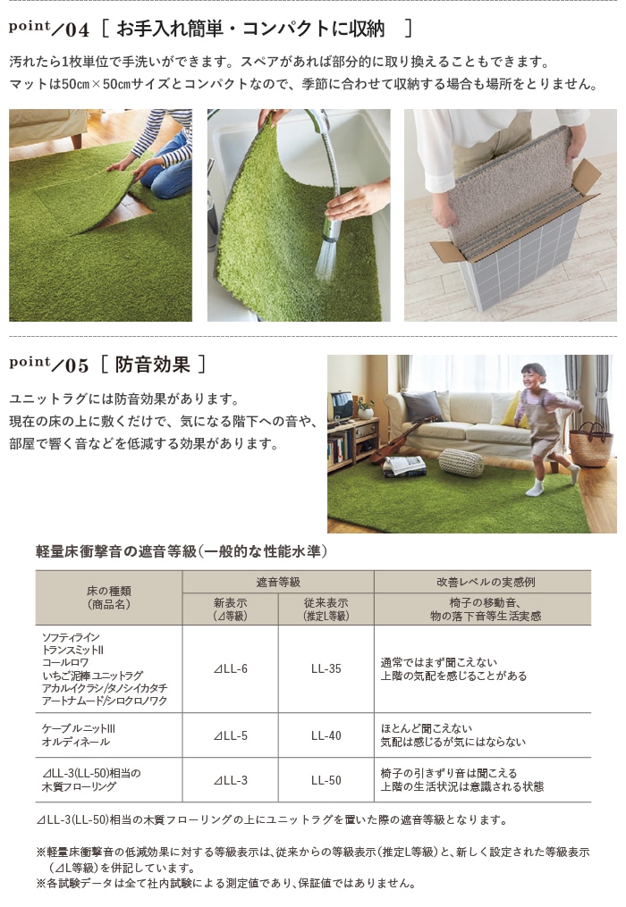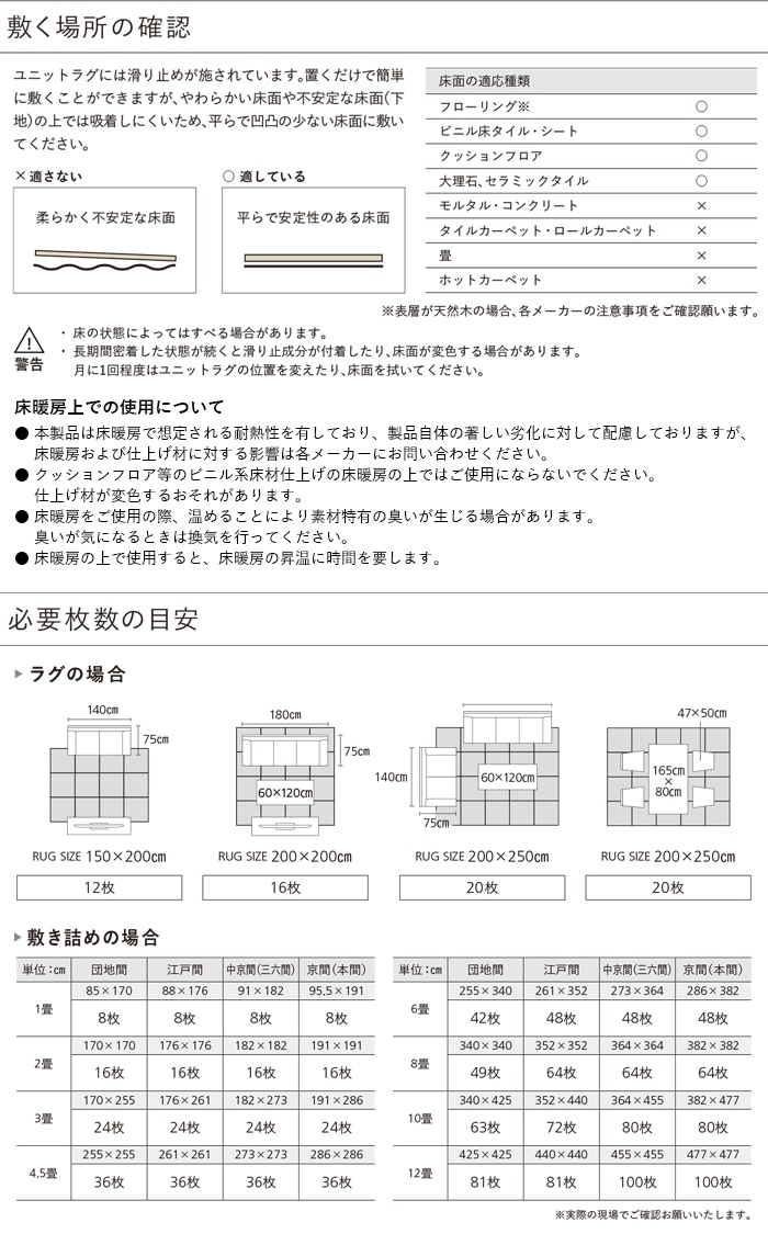| 【注意事項】 ※ やわらかい床面や不安定な床面(下地)の上では吸着しにくく、滑り止めの効果が発揮されません。 ※ 長期間密着した状態が続くと滑り止め成分が付着したり、床面が変色する場合があります。月に1回程度はユニットラグの位置を変えたり、床面を拭いてください。 ※ 床暖房の上で使用できる耐熱性は有しておりますが、床暖房や仕上げ材に対する影響につきましては分かりかねますので、暖房機器メーカーにお問い合わせください。 なお、クッションフロア等のビニル系床材仕上げの床暖房の上ではご使用にならないでください。床材が変色する恐れがございます。 |