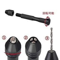 【使用方法】(1)ピンバイスヘッドを回し、クランプ幅を適当に調整してドリルを差し込み、またヘッドを回して固定する。(2)作業相手を固定して、ドリル頭部を手に当て、垂直に力を入れて回転すれば穴が開きます。