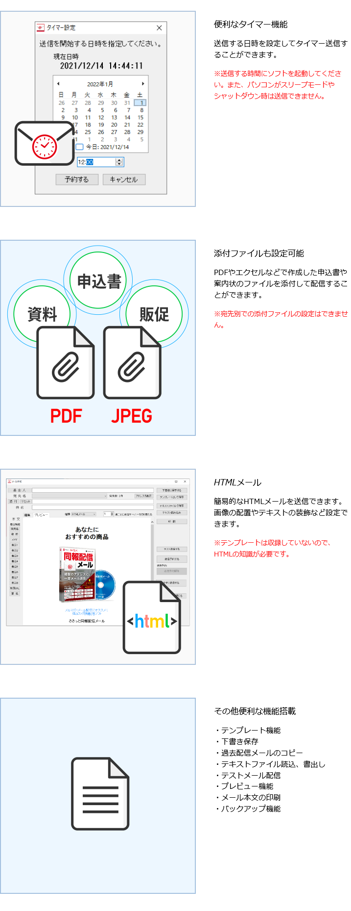 ※本ソフトにはメール送信数の制限等はありませんが、ご利用のプロバイダー、メールサーバーなどにより一度に送信できる送信数に制限がかかる可能性があります。送信に関する制限はご使用のサーバー・プロバイダーによって異なります。