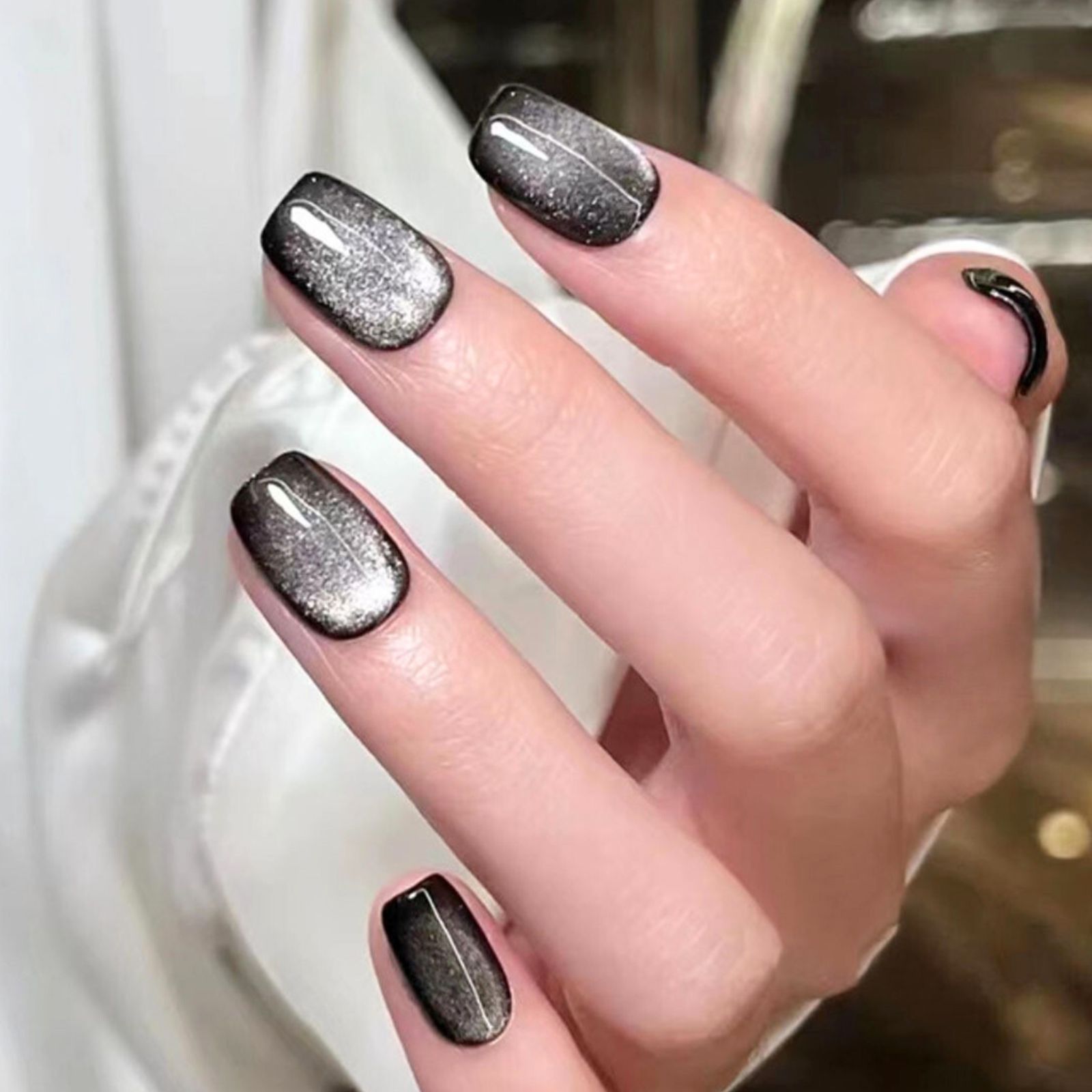 ネイルチップ 24枚 セット つけ爪 ショート キラキラ キャッツアイ 3D パーツ 両面テープ 48枚 スティック やすり アルコールパッド付き マグネット ブラック