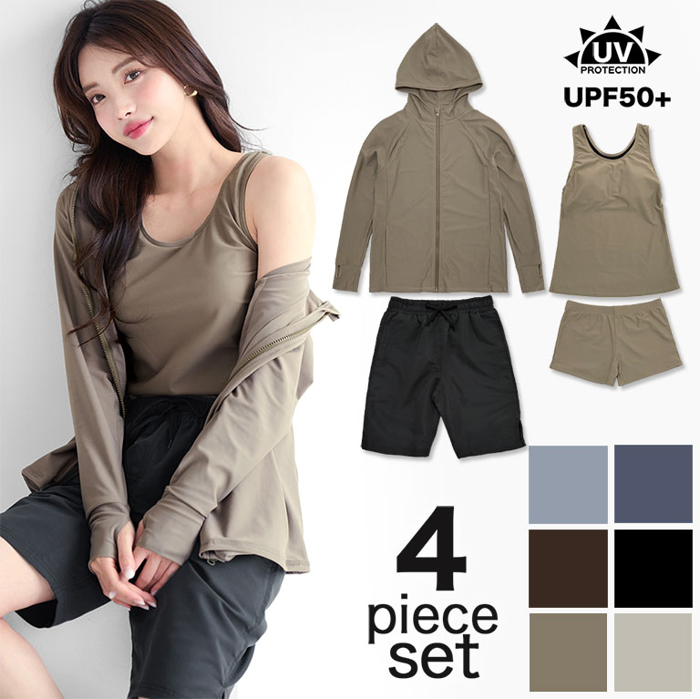 紫外線カット率99.9%以上! UVカット ラッシュガード 水着 4点セット レディース 体型カバー タンクトップ ショーツ セット かわいい rs005set4