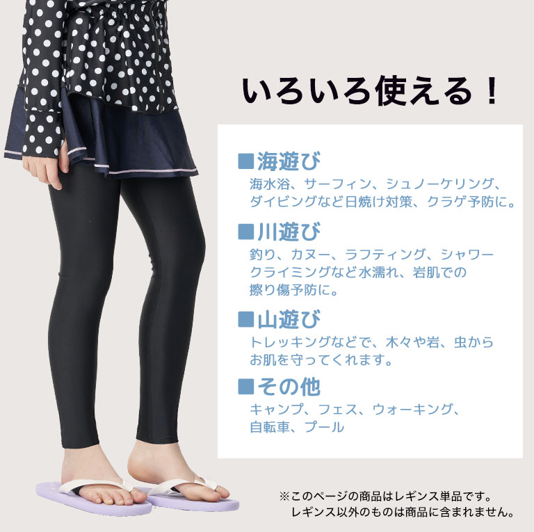 プール、海水浴、キャンプ、川遊び、サイクリング、虫取りなどアウトドア全般に使えるキッズラッシュレギンス。