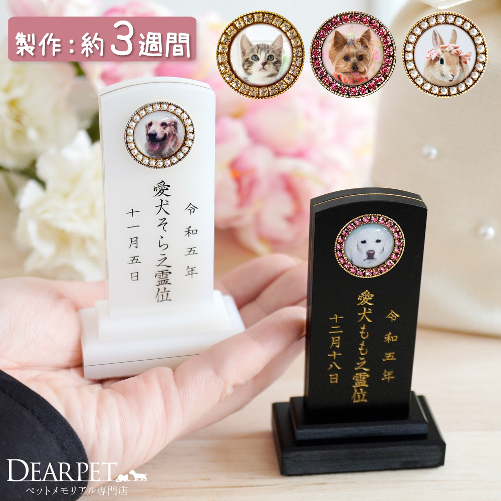 お顔周りのラインストーンがきらきら可愛い、ミニサイズのペット位牌。本格的な彫刻ながら、手のひらサイズで愛らしさもあるお位牌です。- サイズ - 幅 5.3cm×奥行き 2.7cm×高さ 9.2cm - カラー -本体:ブラック(金文字)、ホワイト(黒文字)飾り石:クリア(ラインストーン)、ピンク(ラインストーン)、パールブラックとホワイトで細部の装飾が異なります。詳細はページの画像でご確認ください。 - 素材 - アクリル ■ディアペットではペット位牌に「魂入れ」をする開眼供養祭も行っています。遠方にお住まいの方でも、開眼供養をした上でお手元にお届けすることが可能です。詳細はページ内のご案内をご覧くださいませ(※別途お申込みが必要です)。※関連ワード:ミニ ペット供養 犬 猫 四十九日 ペットロス 写真 遺影 ペットの位牌 名入れ 写真入り f00743