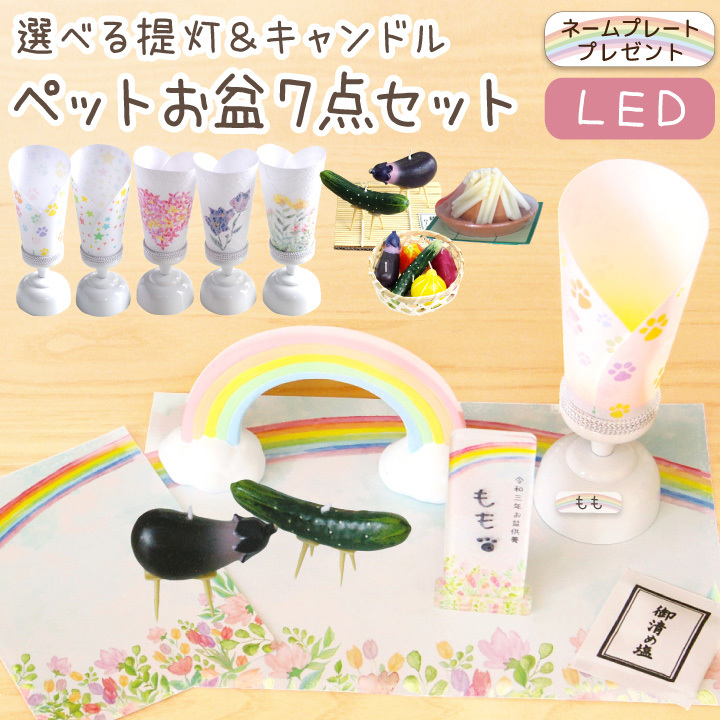 普段の祈りの場にもプラスしやすい、虹の橋のお盆セット&ちょうちん&キャンドルのセットです。思い思いにお盆の祈りの場を用意して、ペットちゃんをお迎えください。