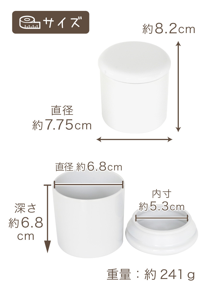 | - サイズ - | 全体サイズ:直径 約7.75cm×高さ 約8.2cm 内側のサイズ:直径 約6.8cm×深さ 約6.8cm 重量:241g |
