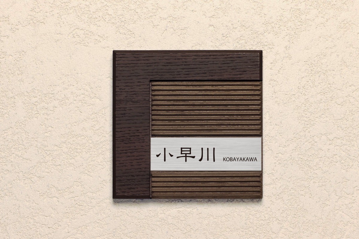 | モダンな木質感とステンレスへアラインを組み合わせてデザインした表札 | |