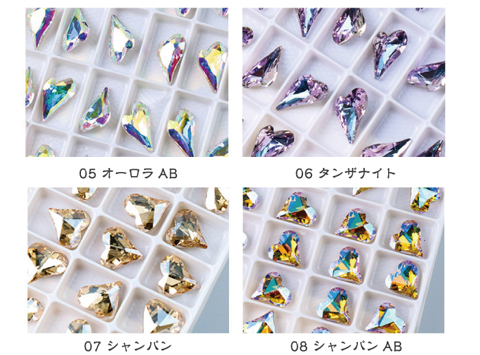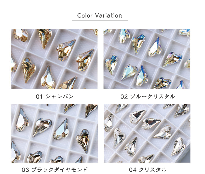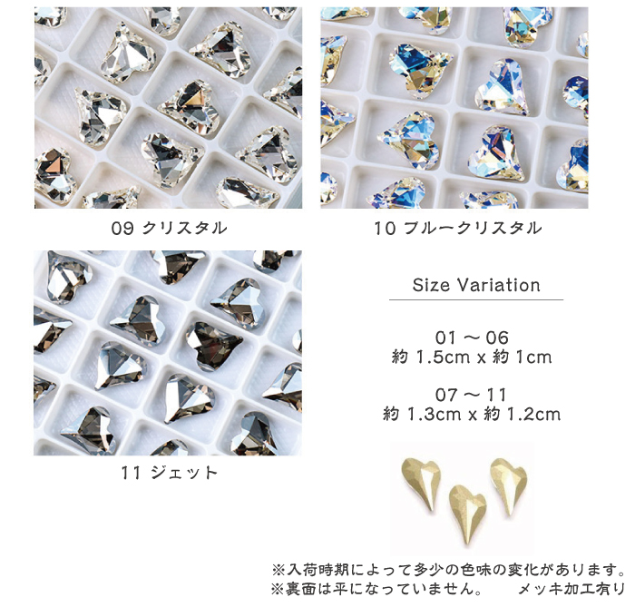 | カラー | 01.シャンパン 02.ブルークリスタル 03.ブラックダイヤモンド 04.クリスタル 05.オーロラAB 06.タンザナイト 07.シャンパン 08.シャンパンAB 09.クリスタル 10.ブルークリスタル 11.ジェット ※入荷時期によって多少の色味の変化があります。 ※裏面は平になっていません。 メッキ加工有り |