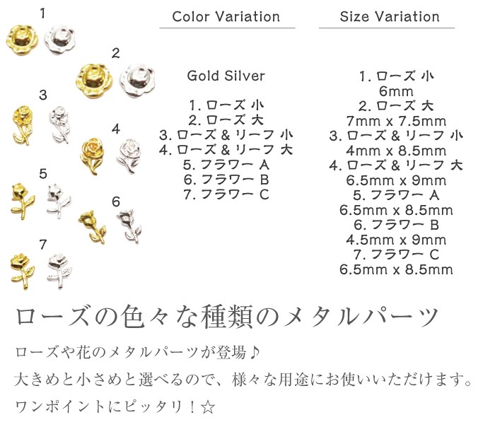 | サイズ | 1.ローズ 小 6mm2.ローズ 大 7mm x 7.5mm 3.ローズ&リーフ 小 4mm x 8.5mm 4.ローズ&リーフ 大 6.5mm x 9mm 5.フラワー A 6.5mm x 8.5mm 6.フラワー B 4.5mm x 9mm 7.フラワー C 6.5mm x 8.5mm