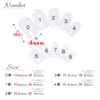 | サイズ | #0:H 約20mm × W 約13mm(チップ内側カーブ 約13mm) #1:H 約20mm × W 約12mm(チップ内側カーブ 約12mm) #2:H 約18mm × W 約11mm(チップ内側カーブ 約13.5mm) #3:H 約17mm × W 約10mm(チップ内側カーブ 約12mm) #4:H 約16mm × W 約9mm(チップ内側カーブ 約11.5mm) #5:H 約15mm × W 約8.5mm(チップ内側カーブ 約11mm) #6:H 約14.5mm × W 約8mm(チップ内側カーブ 約10.5mm) #7:H 約14mm × W 約7.5mm(チップ内側カーブ 約9mm) #8:H 約14mm × W 約7mm(チップ内側カーブ 約8mm) #9:H 約13mm × W 約6mm(チップ内側カーブ 約7.5mm) |