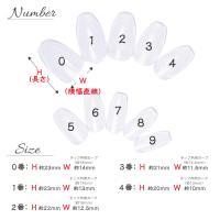 | サイズ | #0:H 約23mm × W 約14mm(チップ内側カーブ 約18mm) #1:H 約23mm × W 約13mm(チップ内側カーブ 約17mm) #2:H 約22mm × W 約12.5mm(チップ内側カーブ 約16mm) #3:H 約21mm × W 約11.5mm(チップ内側カーブ 約14.5mm) #4:H 約20mm × W 約10mm(チップ内側カーブ 約13mm) #5:H 約19mm × W 約9.5mm(チップ内側カーブ 約12.5mm) #6:H 約19mm × W 約9mm(チップ内側カーブ 約12mm) #7:H 約18.5mm × W 約8mm(チップ内側カーブ 約11mm) #8:H 約18mm × W 約7.5mm(チップ内側カーブ 約10.5mm) #9:H 約17mm × W 約6.5mm(チップ内側カーブ 約10mm) |