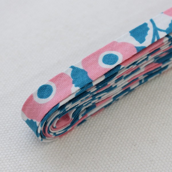 デコレクションズオリジナルのバイアステープ。 コットン100%で柔らかい手触りの4つ折りバイアステープです。 お洋服の裾上げやふちどり、小物の仕上げやリメイクに。 ホワイト地に、ピーコックブルーの葉っぱとパステルピンクの花が大人っぽく上品なデザインです。 |