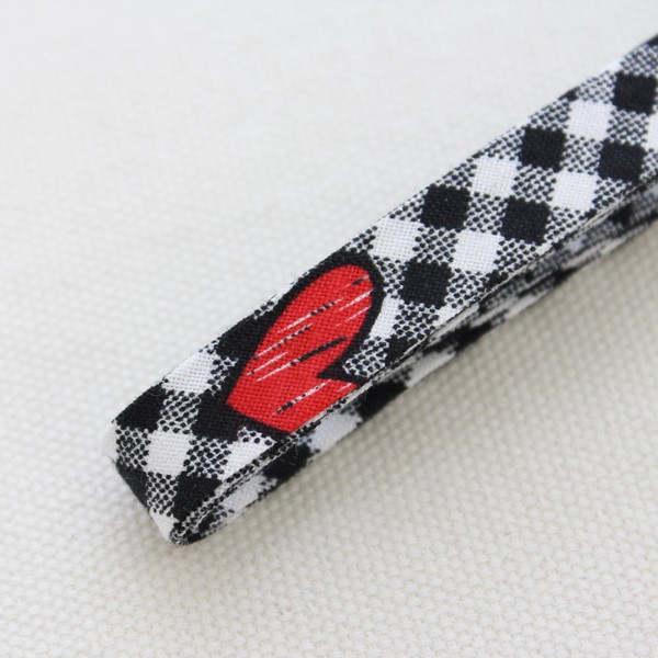 デコレクションズオリジナルのバイアステープ。 コットン100%で柔らかい手触りの4つ折りバイアステープです。 お洋服の裾上げやふちどり、小物の仕上げやリメイクに。 オーソドックスな黒のチェック柄に、真っ赤なハートが目を引くデザインです |