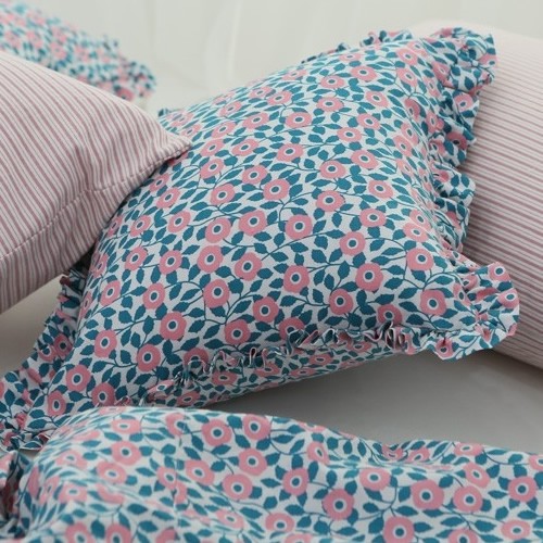 生地一面を覆うように植物が描かれた『ガーデンフラワー』。ホワイト地に、ピーコックブルーの葉っぱとパステルピンクの花が大人っぽく上品な生地です。柄に方向性がなく、洋服やインテリアファブリックなどにオススメです。 |
