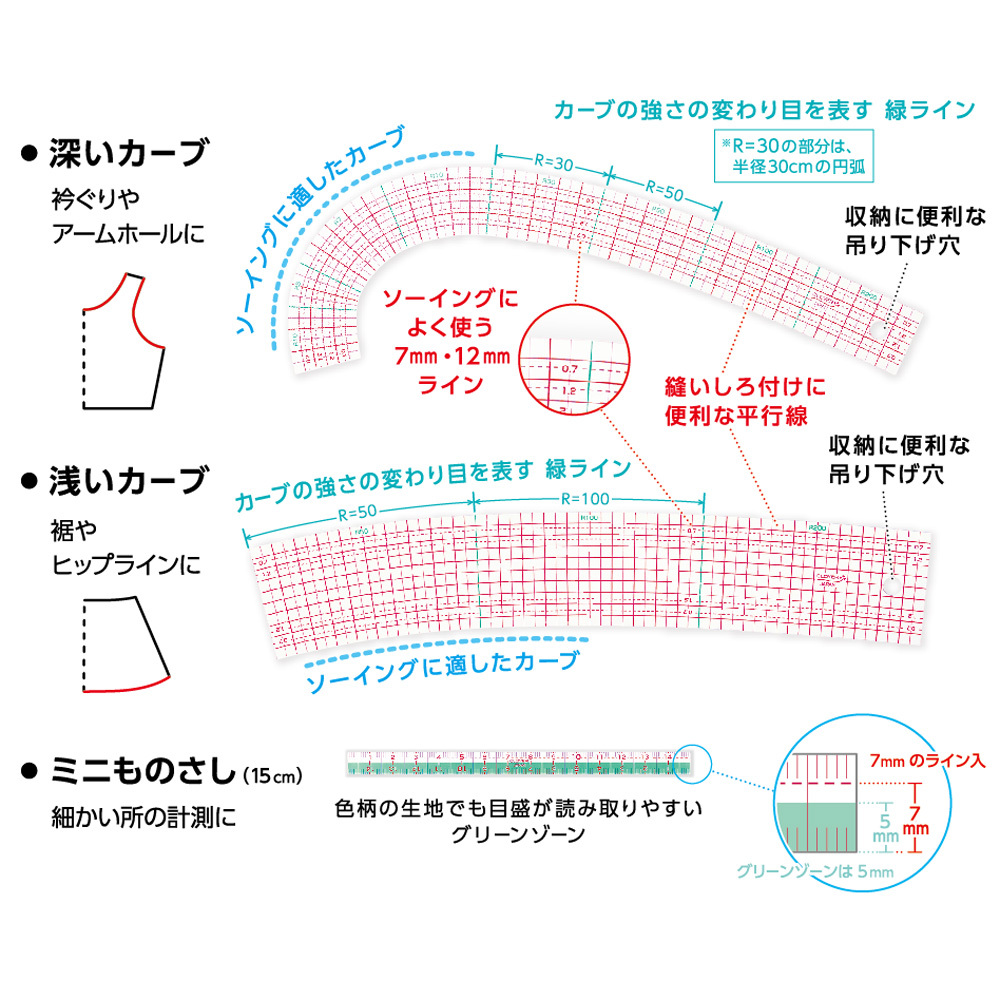 | 深いカーブの定規、浅いカーブの定規、ミニものさし(専用ケース付) |