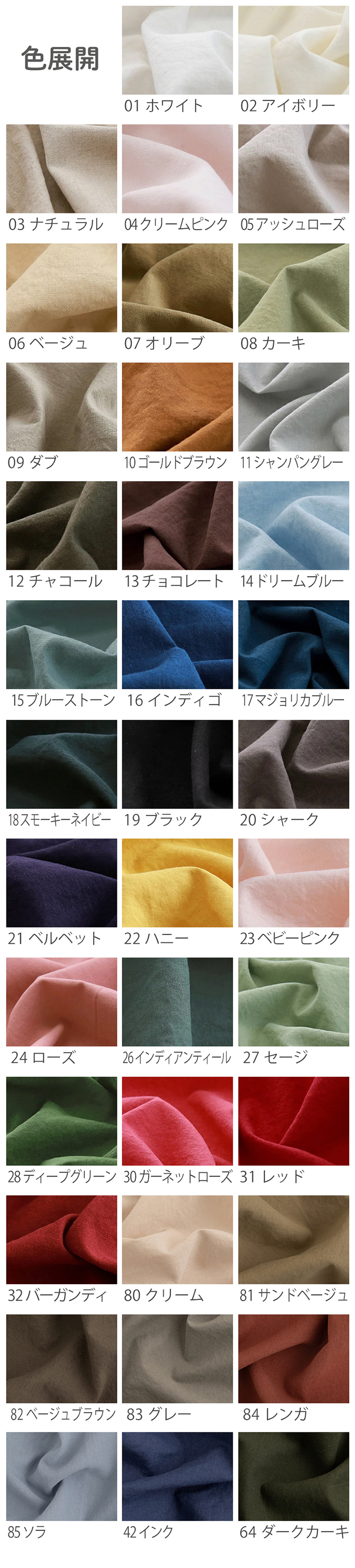 | ・無地ハーフリネン生地と無地バイオウォッシュハーフリネン生地では、同名のカラーでも色味が異なります。 ・リネン特有の色ムラや生地のほつれが見られる場合がございます。生地の特性によるもので避けられないものですので、あらかじめご了承の上お買い求め下さい。 ・製造時期やロット違いにより、色味や風合いに微妙なブレが生じます。 ・ウォッシュ加工を施してあるため、生地の収縮が起こりにくく、水通し不要でお使いいただけます。 ・色落ち、色移りや生地を傷める原因となりますので、長時間のつけ置きや濡れた状態は避けてください。また、お洗濯は単独で行ってください。 ・乾燥機は使用しないでください。 |