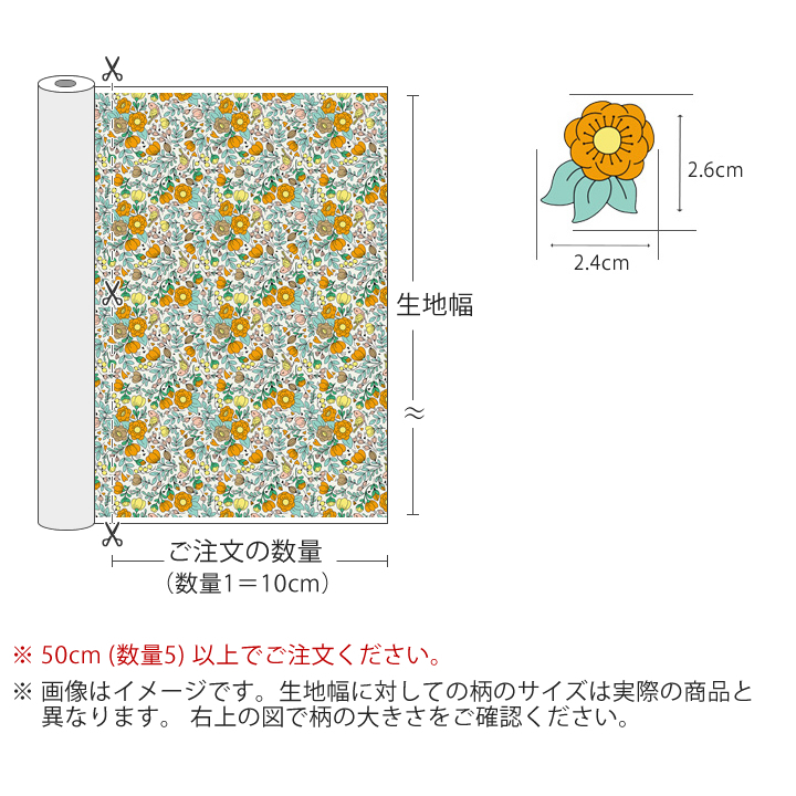 | オーダーカット販売 生地幅×10cm単位(ご注文数量1=10cm) 必ず50cm(数量5)以上でご注文下さい(売切れの場合は除きます) 例)「数量5」でご注文→生地幅×50cmの生地 「数量23」でご注文→生地幅×230cmの生地 |