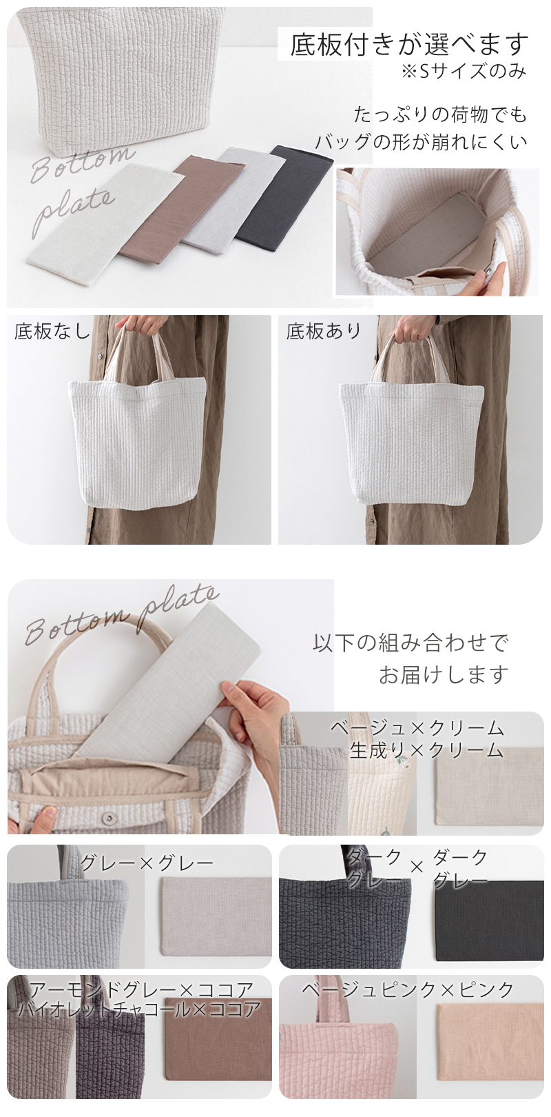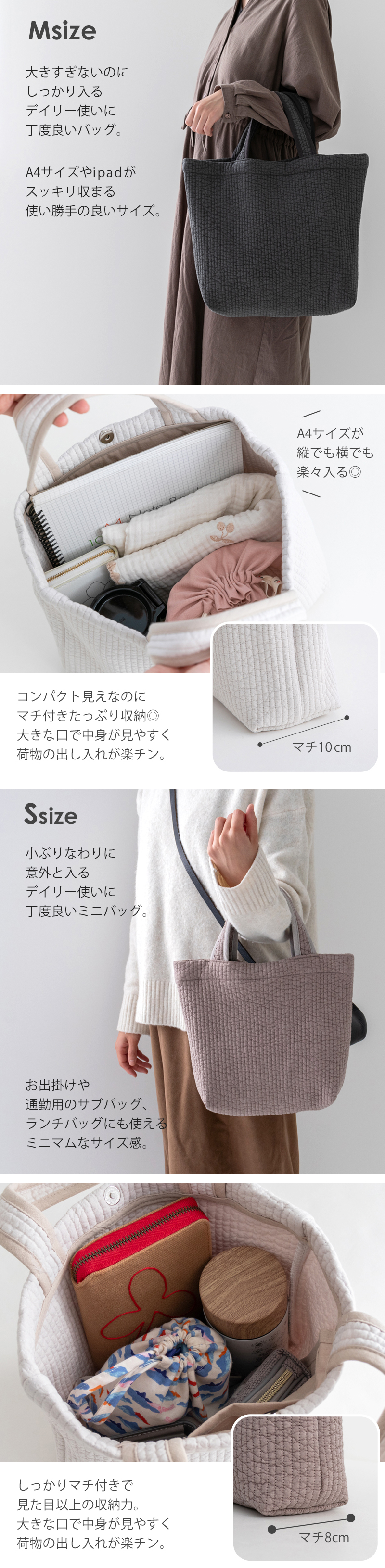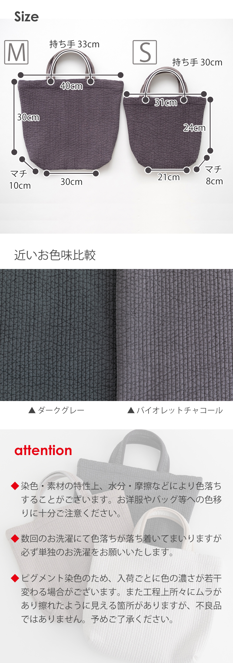 | 【Mサイズ】 幅:約40cm(底幅:約30cm)×高さ:30cm×マチ:10cm 持ち手(長さ) 33cm 内ポケット(長さ) 縦:約17.5cm×横:約20cm 【Sサイズ】 幅:約31cm(底幅:約21cm)×高さ:24cm×マチ:8cm 持ち手(長さ) 31cm 内ポケット 縦:約15cm×横:約17cm 底板:約22.5cm×8cm(厚さ2.5mm) |