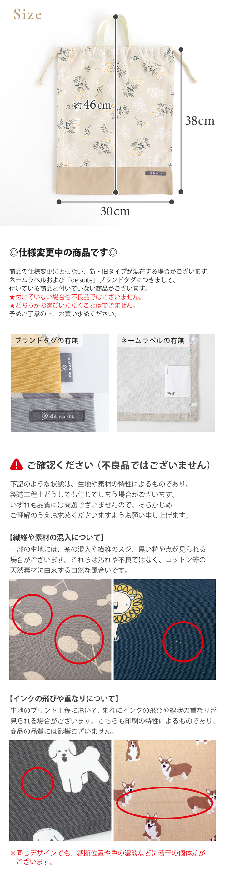 | ・サイズには1cm程度の誤差が生じることがございます。 ・「de suite」ブランドタグを付ける仕様に変更中の商品です。付いている商品と付いていない商品がございますが、ついていない場合も不良品ではございません。予めご了承の上、お買い求めください。 ・巾着紐のループエンドは「なし」に仕様変更となりました。 ・総柄生地を縫製しているため、製品によって柄の出方が異なります。 ・同一製品であっても、色やサイズに若干の違いがある場合がございます。 ・一部の生地にみられる黒の点々は汚れや不良ではありません。コットンの殻のかけらで、自然そのままの布地ならではの風合いです。 ・一部の生地にみられる糸の混入や繊維のスジは不良ではありません。生地の特性によるもので避けられないものですので、あらかじめご了承の上お買い求め下さい。 |