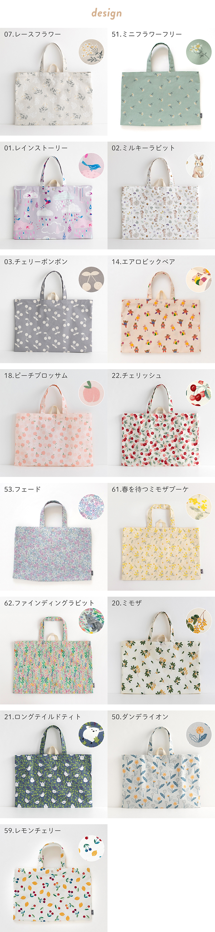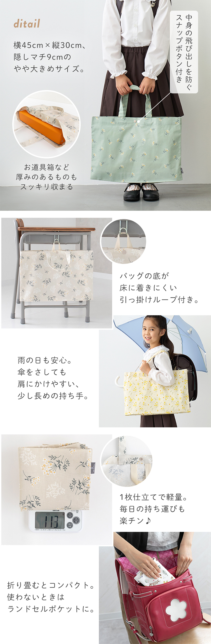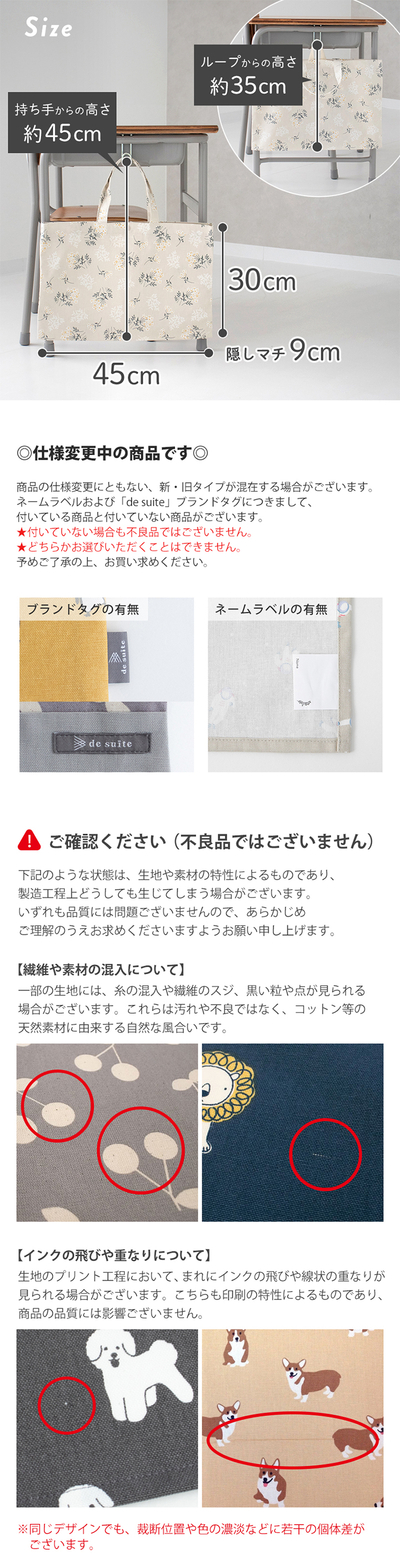 | 幅:約45cm×高さ:約30cm マチ:約9cm(隠しマチ) 持ち手からの高さ:約45cm ループからの高さ:約35cm |