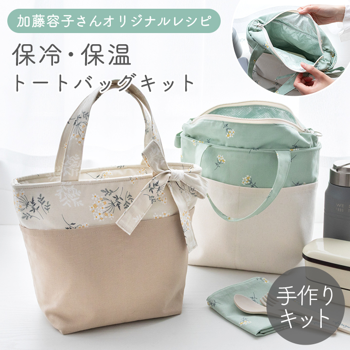 ・柄オックス生地:縦100×横45cm/1枚 ・無地オックス生地:縦53×横52cm/1枚 ・保冷・保温シート:縦70×横43cm/1枚 ・接着芯:縦65×横58cm/1枚 ・YKKビスロンリングファスナー(リングスライダー)35cm/1本 ・加藤容子さんオリジナルレシピ/1セット |