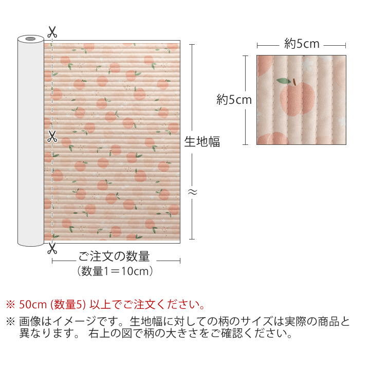 | オーダーカット販売 生地幅×10cm単位(ご注文数量1=10cm) 必ず50cm(数量5)以上でご注文下さい(売切れの場合は除きます) 例)「数量5」でご注文→生地幅×50cmの生地 「数量23」でご注文→生地幅×230cmの生地 |