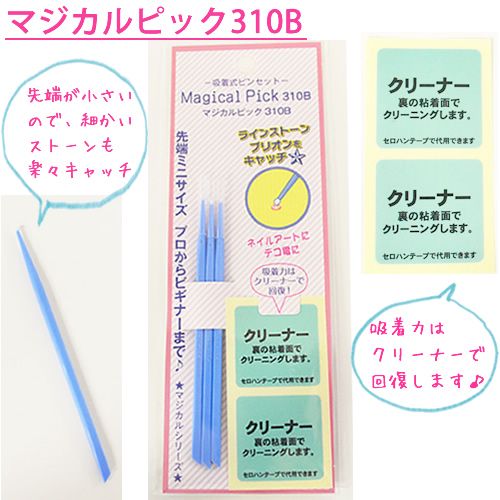 スティックの先端特殊な吸着樹脂がついています。絶妙なくっつく力でラインストーンなどをピックアップし、 接着剤 を塗った上にすいすい貼って行くことができます。