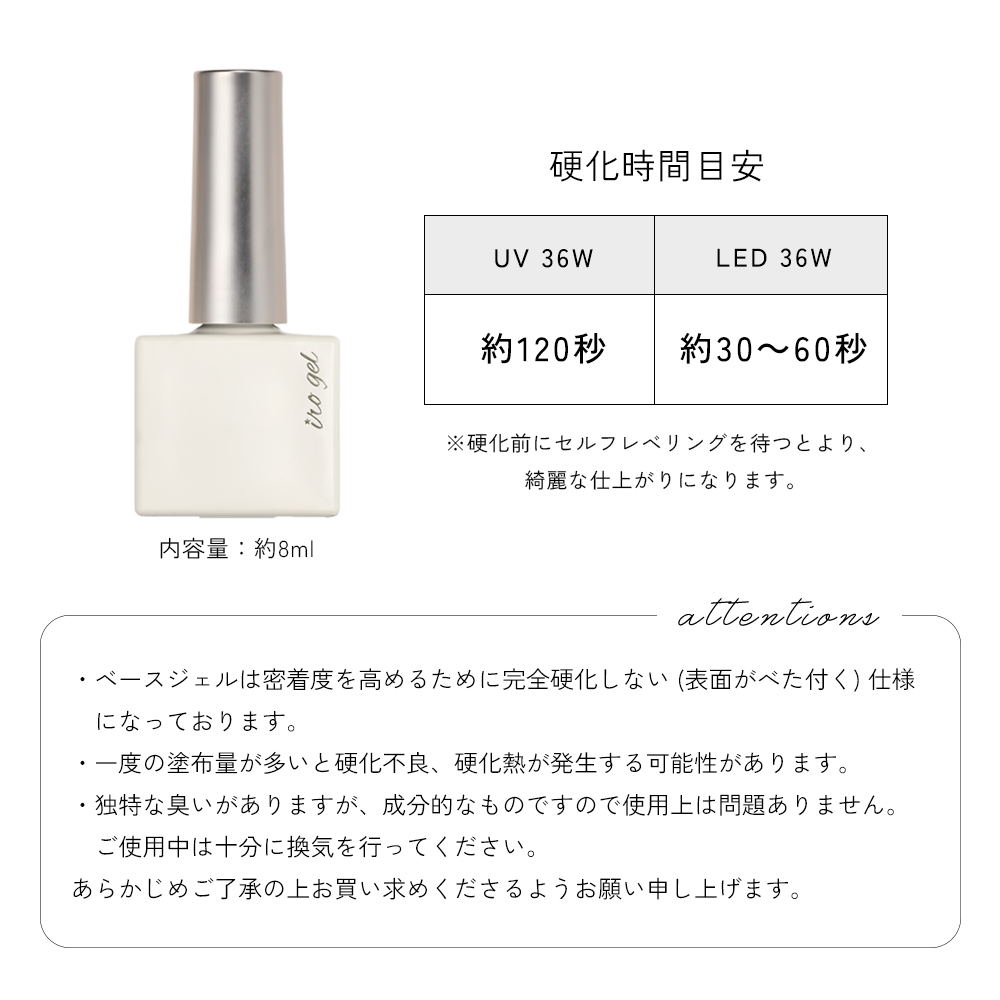・ベースジェルは密着度を高めるために完全硬化しない(表面がべたつく)仕様になっております。