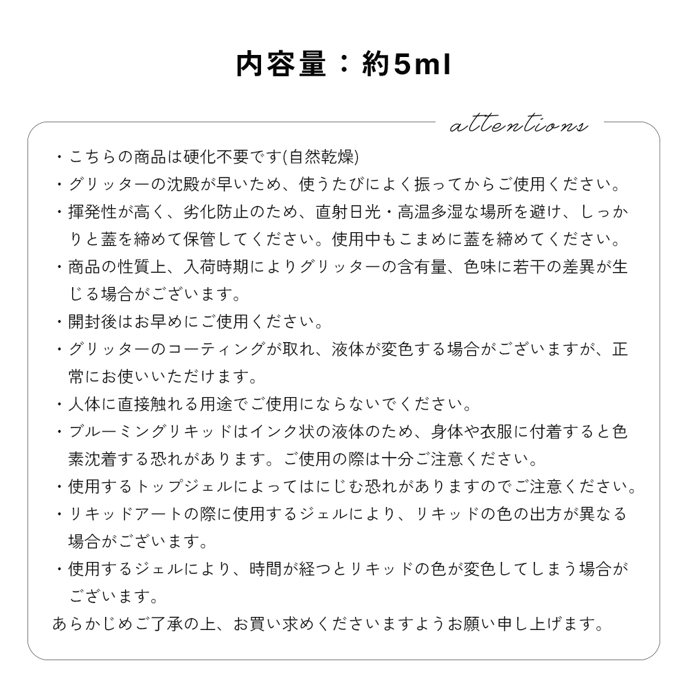 ・グリッターの沈殿が早いため、使うたびによく振ってからご使用ください。