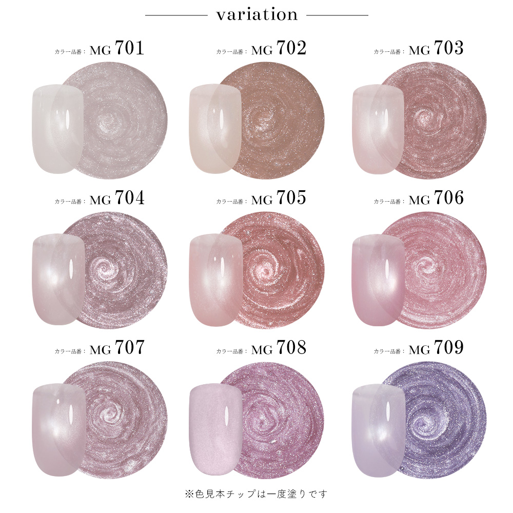 ・本商品は酸の影響を受けやすい特性があるため、お爪の状態や使用するジェルとの相性によって仕上がりが異なる場合があります。ご使用前に、現在お使いのベースジェルでの事前確認を行っていただくか、ベースジェルの上に一度クリアジェルを塗布してからの使用を推奨します。