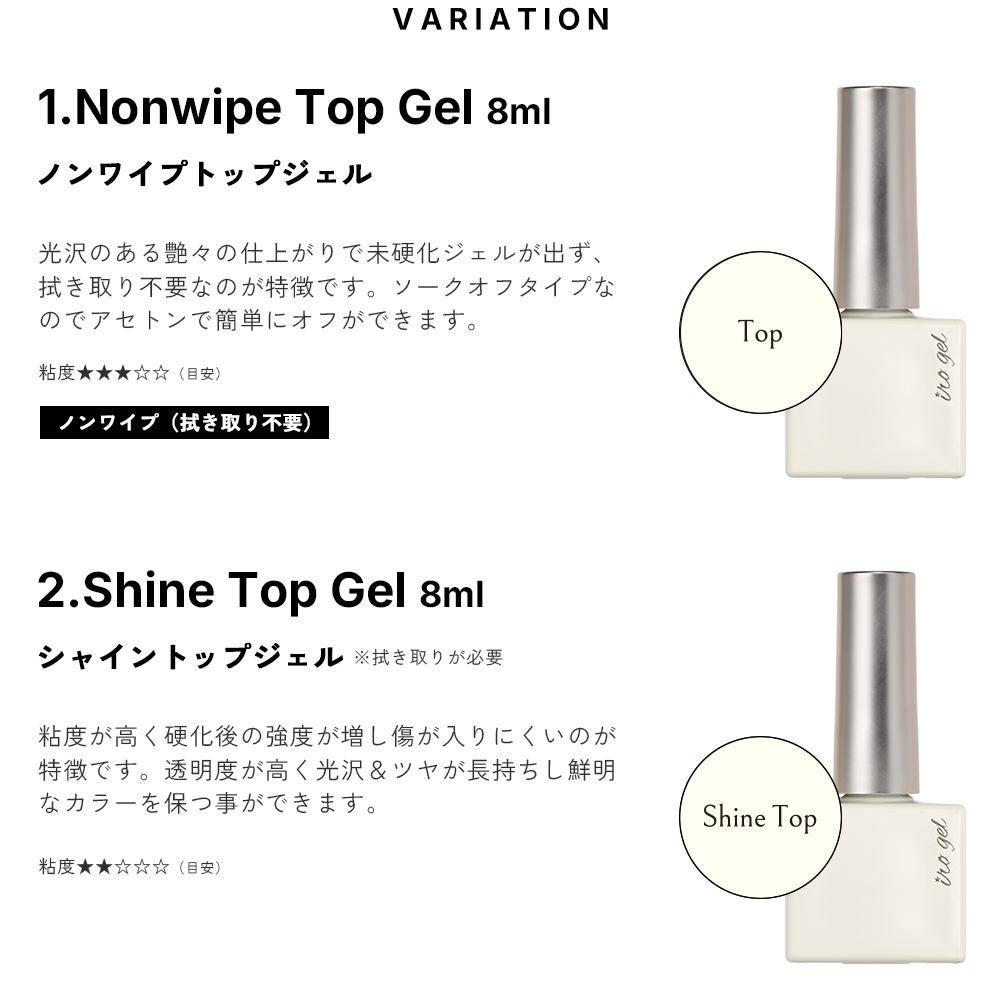 ・シャイントップジェル:硬化後、未硬化ジェルを拭き取ってください。