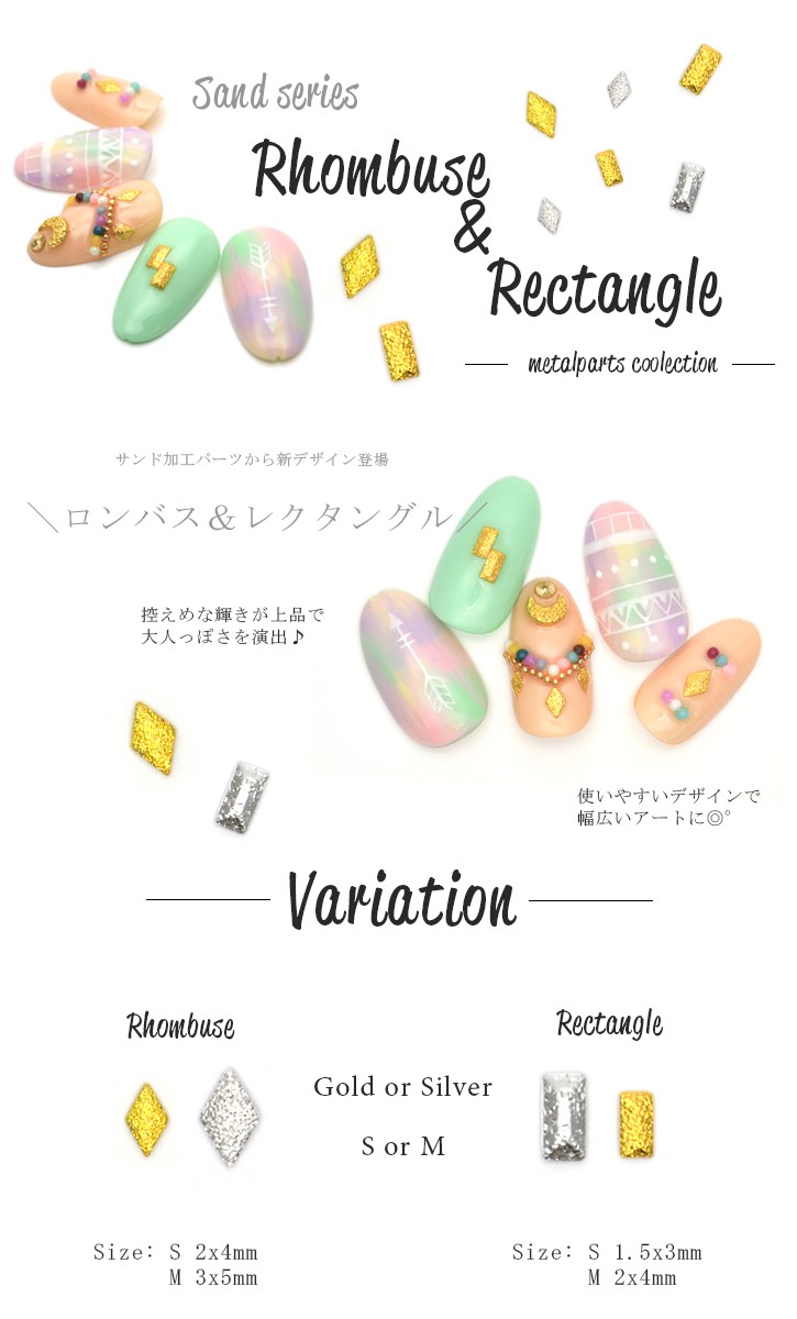 [ネコポス送料無料]サンドレクタングル&ロンバス(ゴールド/シルバー)2サイズ 10個入り 長方形 ひし形 ネイルパーツ ジェルネイル