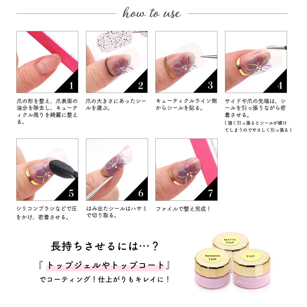※ベースコートを塗っていただくと凹凸なく綺麗に貼れ、爪の表面を保護できるのでおすすめです。