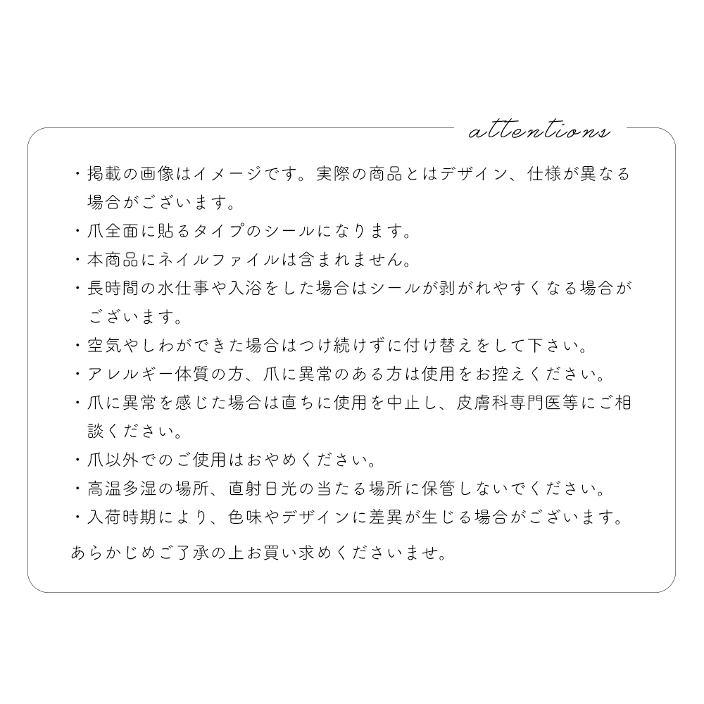 ・アレルギー体質の方、爪に異常のある方は使用をお控えください。