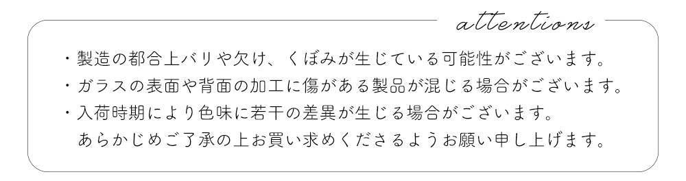 ・ガラスの表面や背面の加工に傷がある製品が混じる場合がございます。